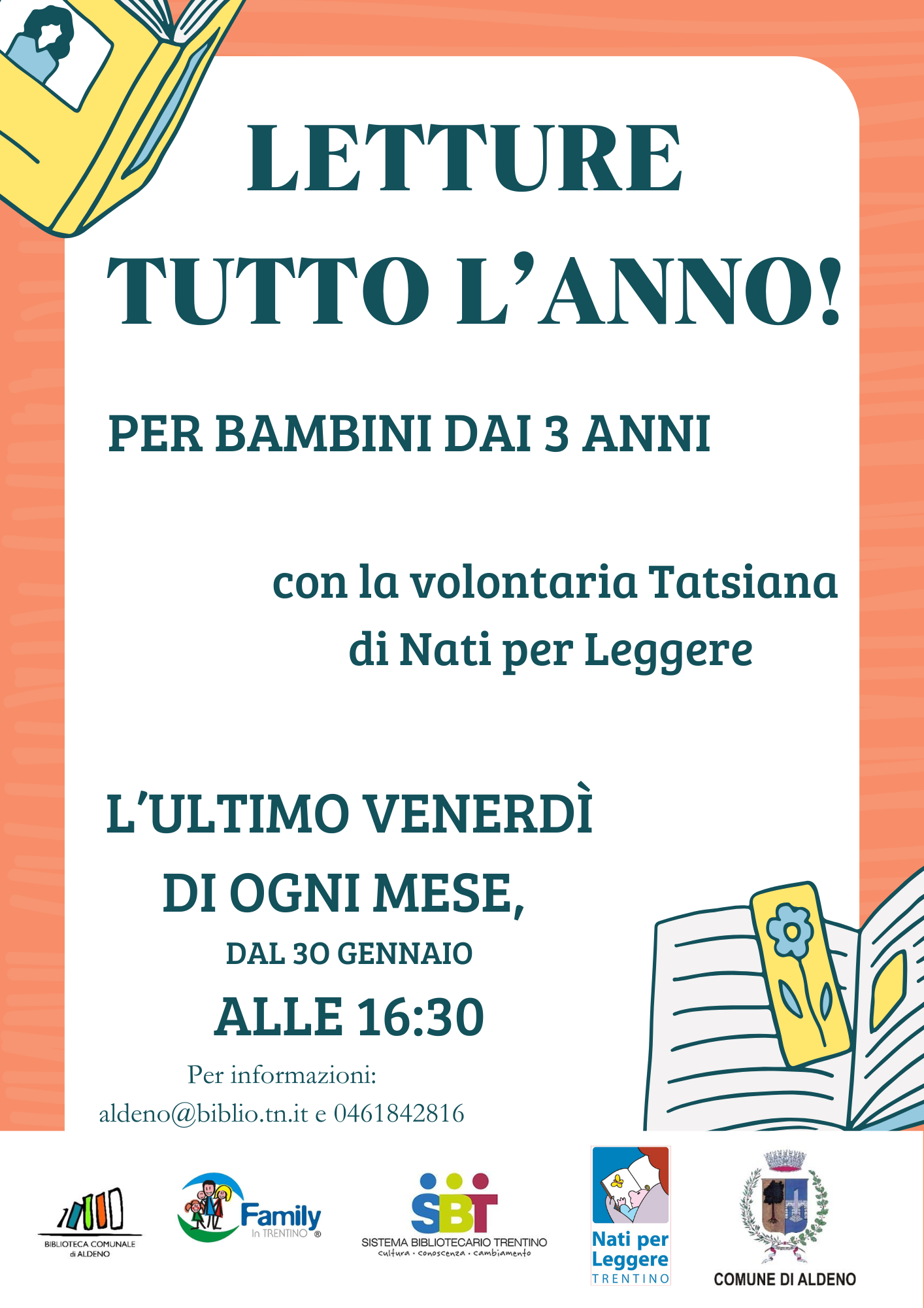 Cos'è Da venerdì 30 gennaio prendono il via le Letture tutto l'anno:letture per bambini dai 3 anni con la volontaria Nati per Leggere Tatsiana,ogni ultimo venerdì del mese alle 16.30 in biblioteca.